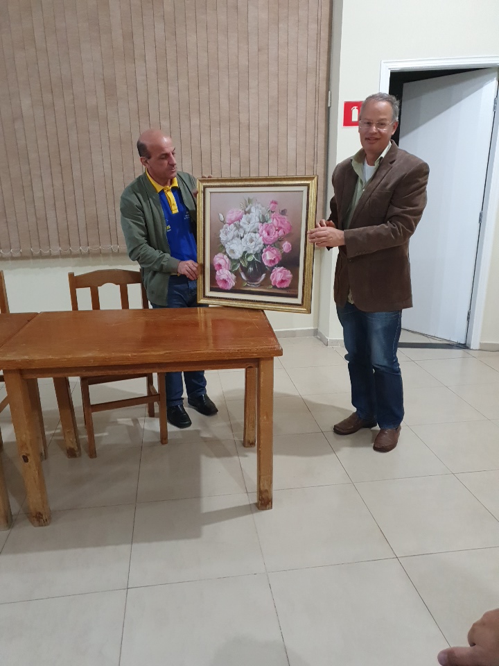 Hieraŭ, en la unua tago de nia vintro, Ladislau, sekretario de Rotaria Esperanto-Klubo Brazilo, vizitis Rotaria Klubo de Sankta Jozefo de Rio Pardo en la brazila subŝato San-Paŭlo. Dum la vizito, Ladislau donacis pentraĵon al sia kolego Luciano kiel gesto de amikeco kaj dankemo.