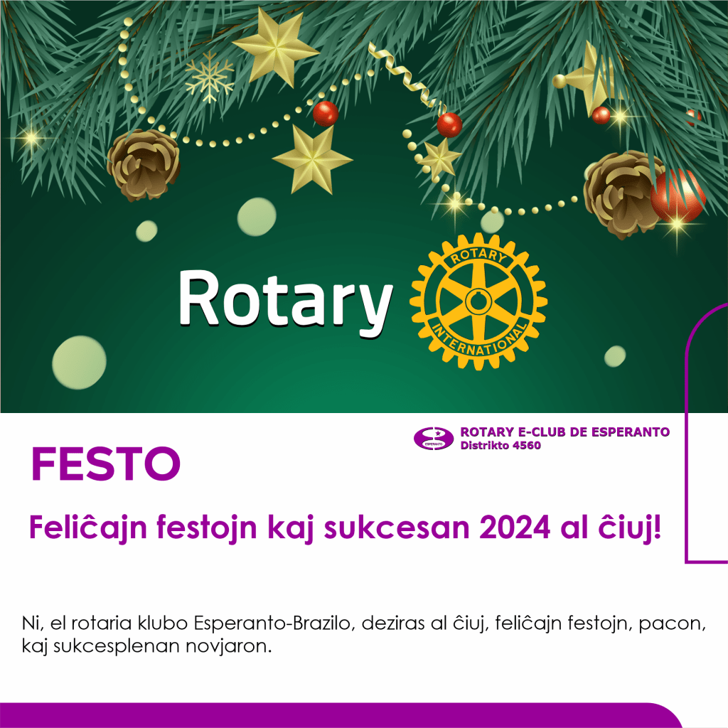 Nome de la Rotaria Klubo Esperanto-Brazilo, ni deziras al ĉiuj, feliĉajn festotagojn kaj bondezirojn por la venonta jaro. Estu certaj, ke ni daŭre laboros por plibonigi nian komunumon kaj plenumi niajn idealaĵojn.