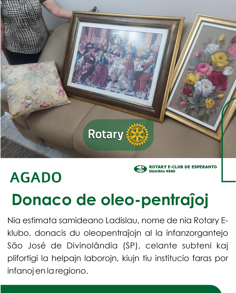 Nia estimata samideano Ladislau, en nome de nia Rotary E-klubo, faris belan kaj valoran geston donacante du oleo-pentraĵojn al la infanzorgantejo São José de Divinolândia (SP). Ĉi tiu nobleco celas subteni kaj plifortigi la helpajn laborojn, kiujn tiu institucio diligente faras por infanoj en la regiono. La donitaj pentraĵoj ne nur riĉigos la medion de la infanzorgantejo, sed ankaŭ portas la eblon esti venditaj, kio permesos al la institucio akiri necesan monon por daŭrigi siajn valorajn iniciatojn. Tiu ĉi gesto ne nur montras solidarecon, sed ankaŭ inspiron al aliaj por kontribui al la bonfarto de infanoj, montrante, ke kun malgranda ago ni povas fari grandan diferencon en la vivoj de tiuj, kiuj bezonas ĝin plej. Ni dankas Ladislau pro sia sindediĉo.