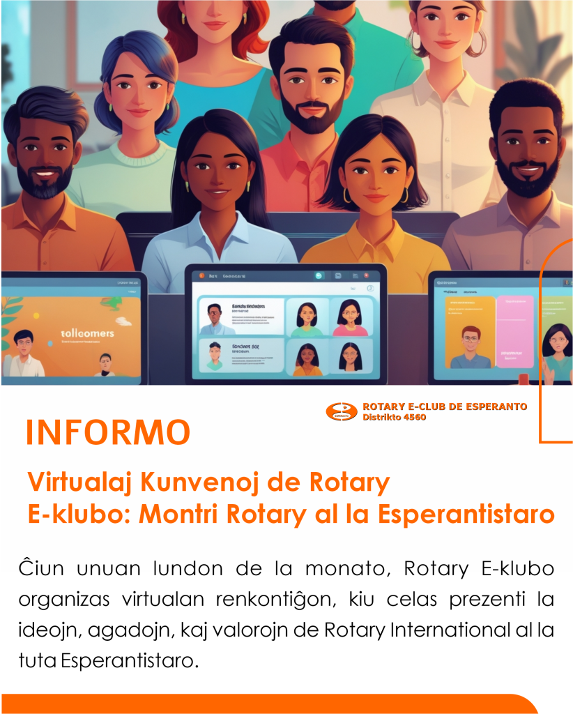 Ĉiun unuan lundon de la monato, Rotary E-klubo organizas virtualan renkontiĝon, kiu celas prezenti la ideojn, agadojn, kaj valorojn de Rotary International al la tuta Esperantistaro. Ĉi tiuj kunvenoj estas neperdebla ŝanco por Esperantistoj el ĉiuj landoj ekscii pri la klubo, ĝiaj projektoj, kaj kiel oni uzas Esperanton por antaŭenigi internacian kompreniĝon kaj servon al la homaro.