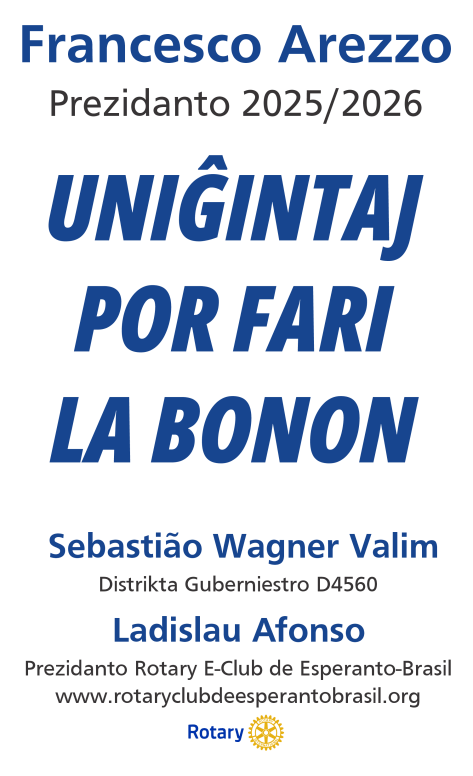 Do, mi invitas vin ĉiujn: restu aktivaj, partoprenu, proponu, partumu. Ĉiu ideo, ĉiu gesto, ĉiu interago helpas nin konstrui klubon, pri kiu ni povas fieri — klubon kiu vere vivigas la idealojn de Rotary kaj de Esperanto.