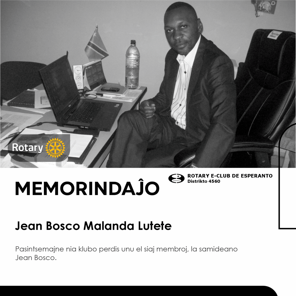 Kun profunda malĝojo, la Rotaria Klubo Esperanto Brazilo anoncas la forpason de nia amata membro, Jean Bosco Malanda Lutete. Jean Bosco naskiĝis en Kongo kaj estis vigla kaj laborema membro de nia klubo, ĉiam dediĉita al la principoj de Rotario kaj al la disvastigado de Esperanto.